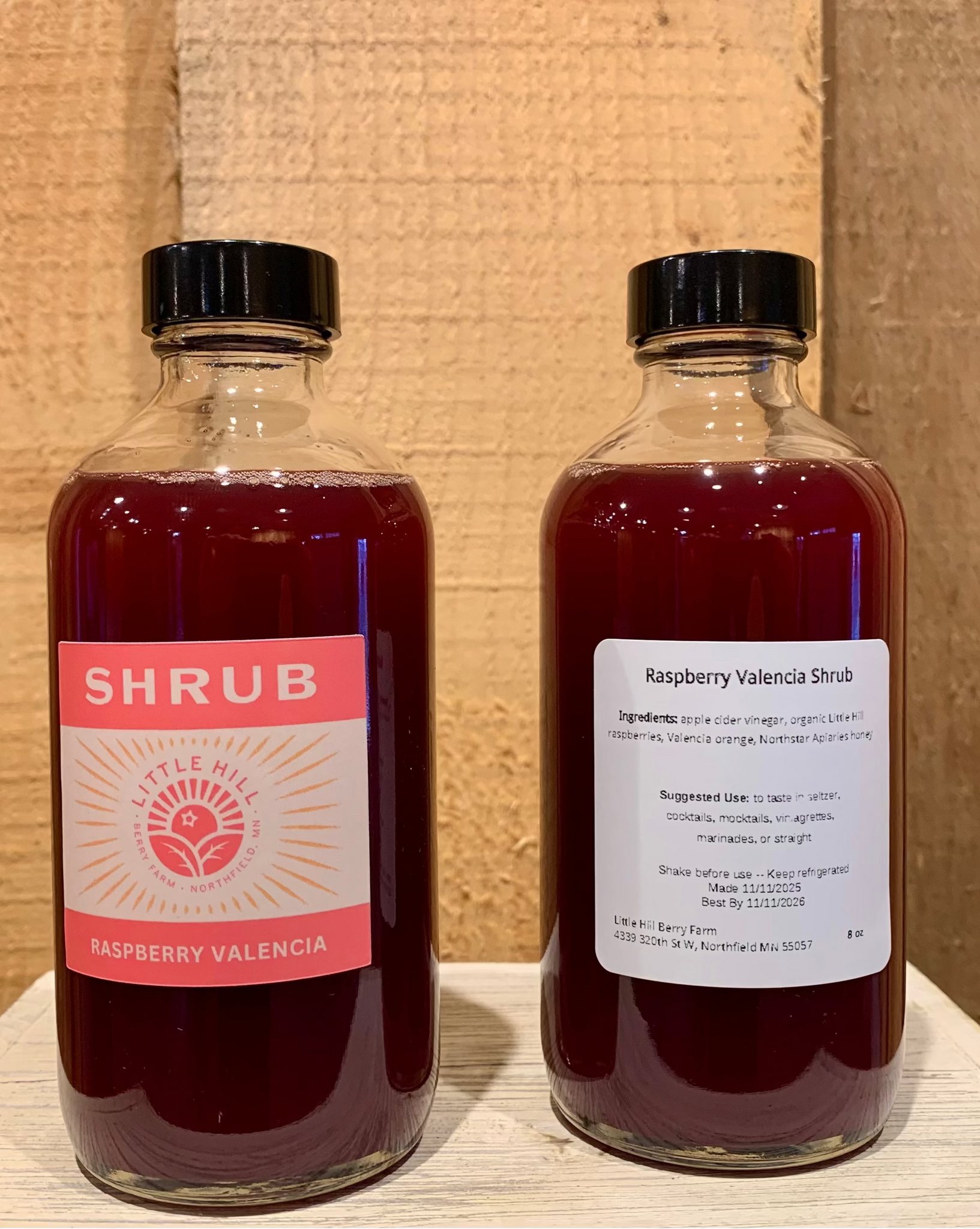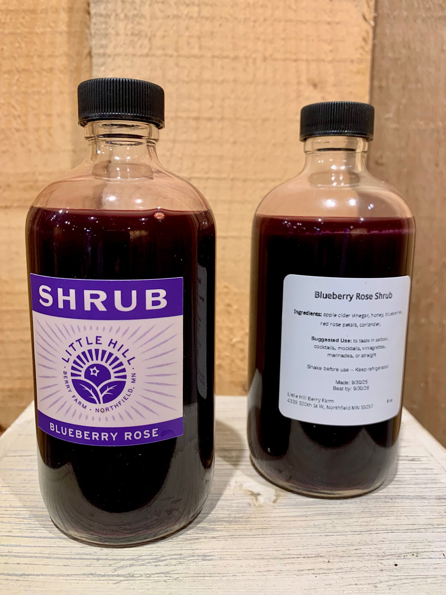 Shrubs, also known as drinking vinegars, are concentrated syrups used in beverages. They have an unique sweet, acidic taste. Shrubs were popular in colonial America as a way to preserve berries for the winter, a tradition that we are continuing at our farm.